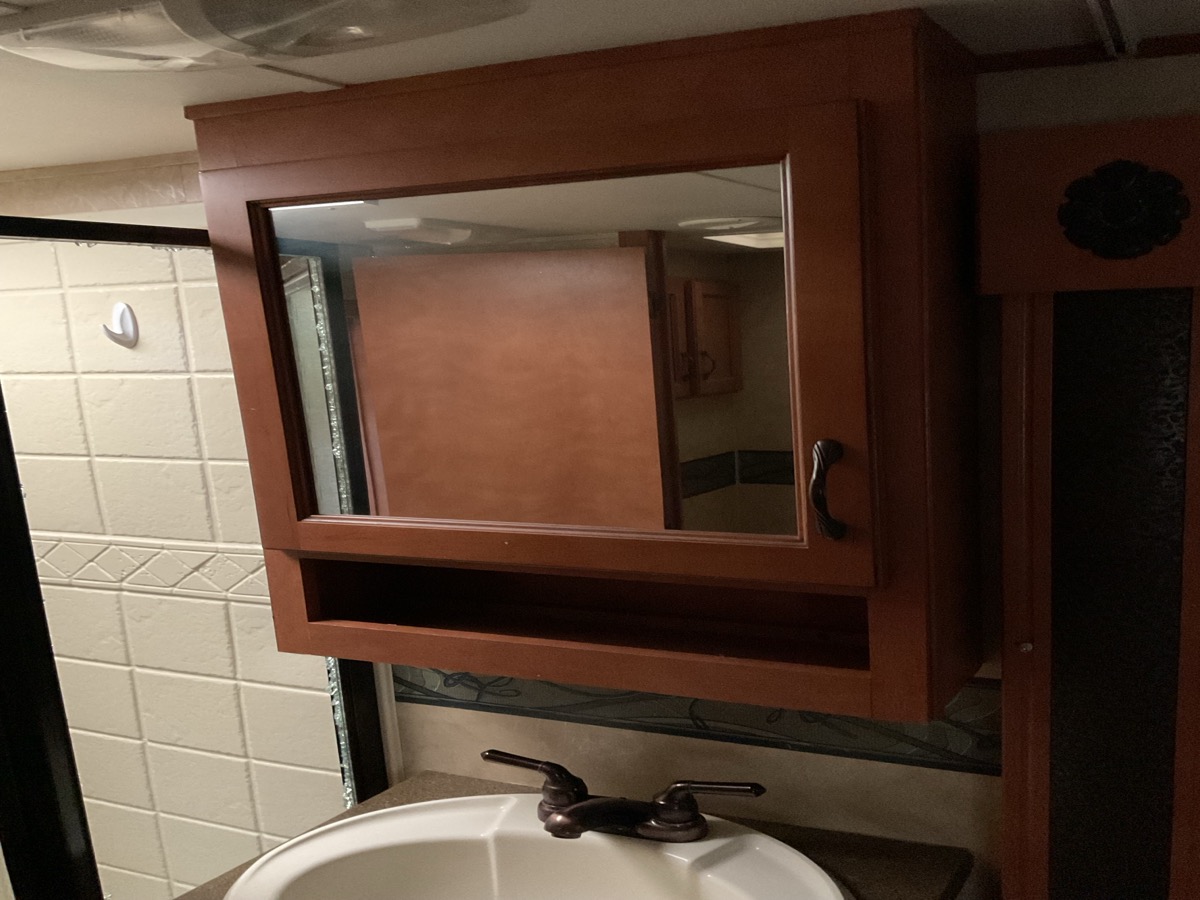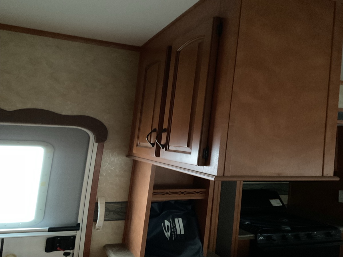Cabinets and drawers kept clean, no bad smells. Kitchen tabletop is worn. Countertops are good. Carpets are stained. Has power, all lights working beside stovetop light. Appliance shop in good shape and operational. Shower glass pane missing/broken. Some