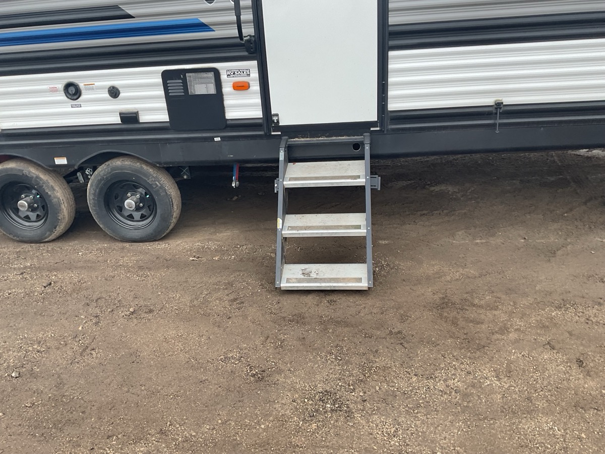 Ceiling in bathroom around sun light is a little soft. Door has a section of trim that’s bent outward a little bit, steps are a little beat up