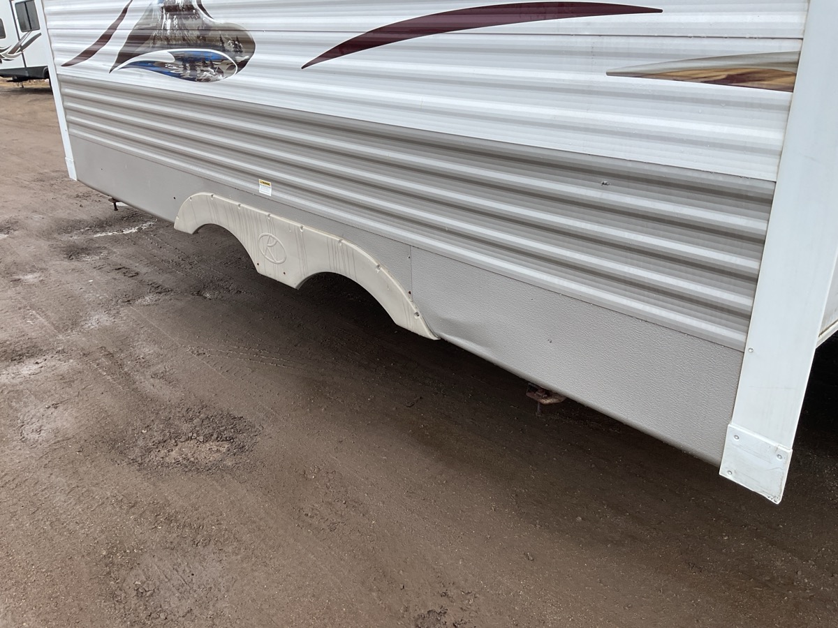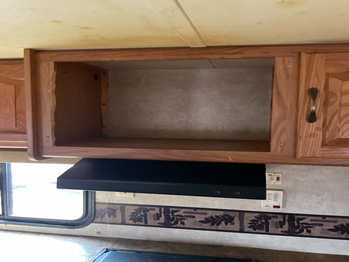 Carpets soiled, extension floor bends. Missing overhead cupboard door. Overhead window above main bed leaks. Overhead light above kitchenette table not mounted. Missing propane tanks. Pullout steps to main entrance broken. Furniture cushions soiled.